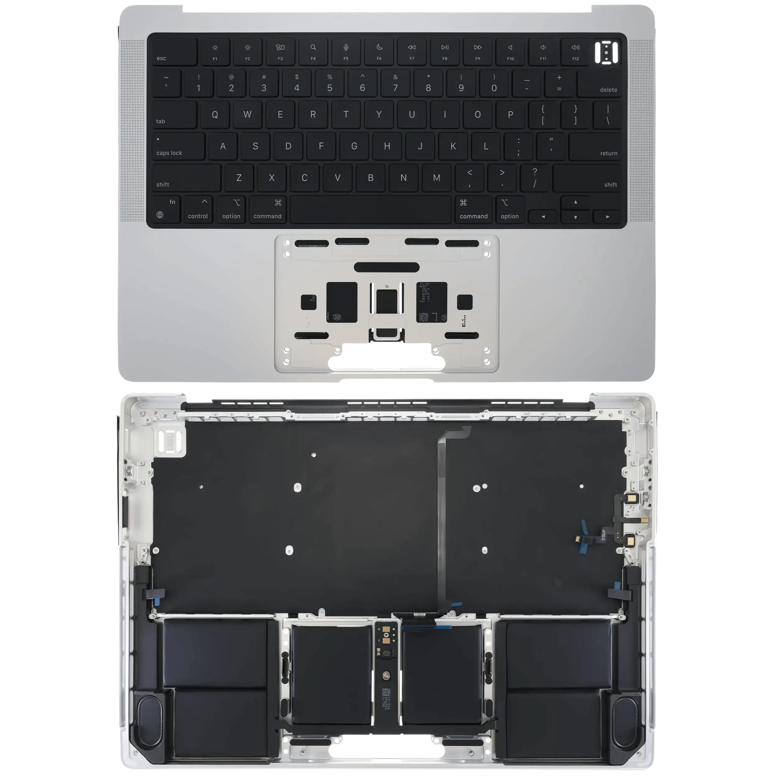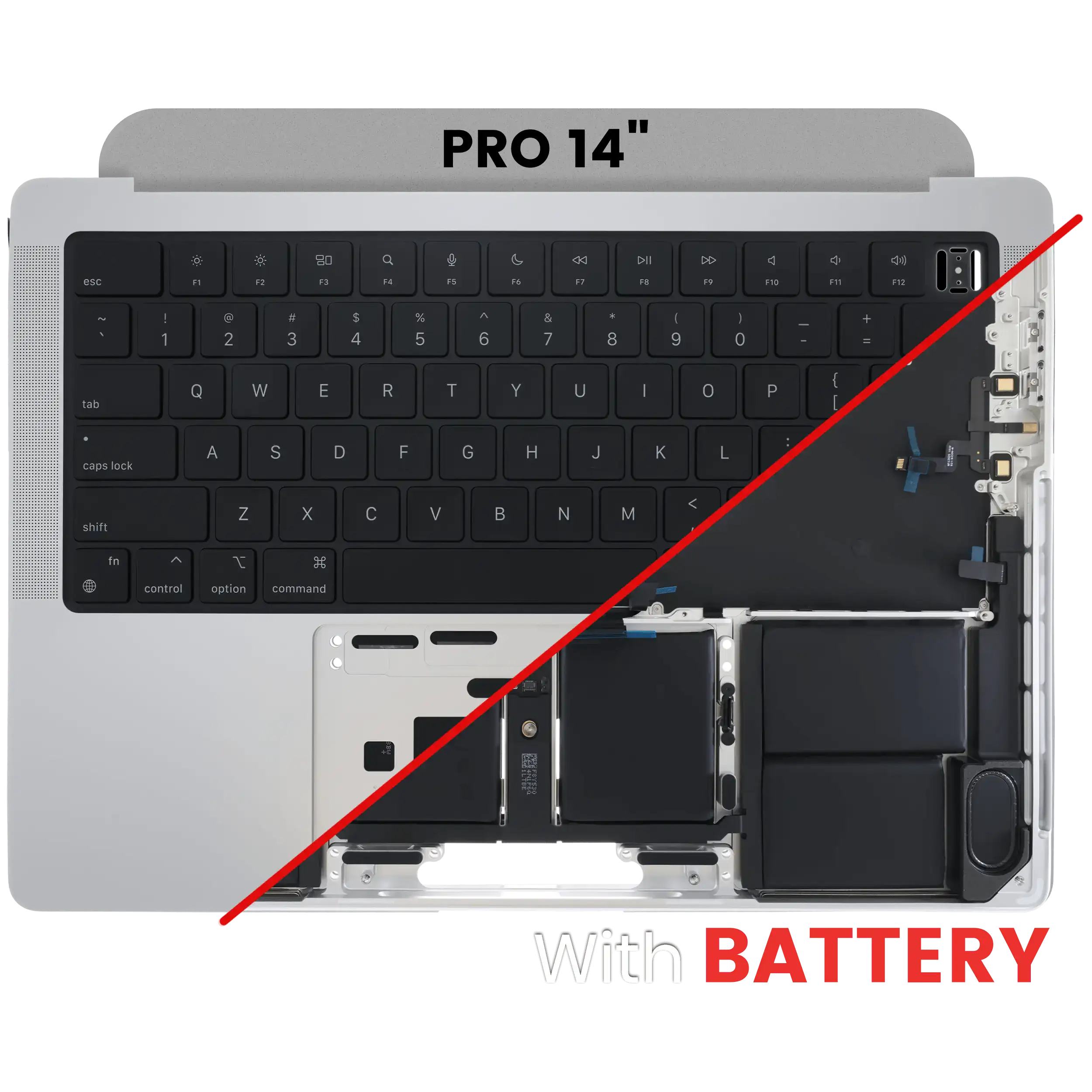 Top Case Assembly With Battery And Keyboard MacBook Pro 14" (A2442 / Late 2021) / Pro 14" (A2779 / Early 2023) (US Keyboard) (Silver) (Genuine OEM) The Top Case replacement part includes a battery. In the future, a battery replacement part will be available.